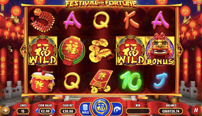 NetGaming’s Festival of Fortune slot game, takes players into a vibrant Chinese New Year celebration, brimming with color, excitement, and the promise of wealth. This 5×3 slot features a Lucky Lion Bonus that can activate free spins. Additionally, the Mystery Replace feature offers the chance to win up to 27 extra free spins if fortune favors you!
