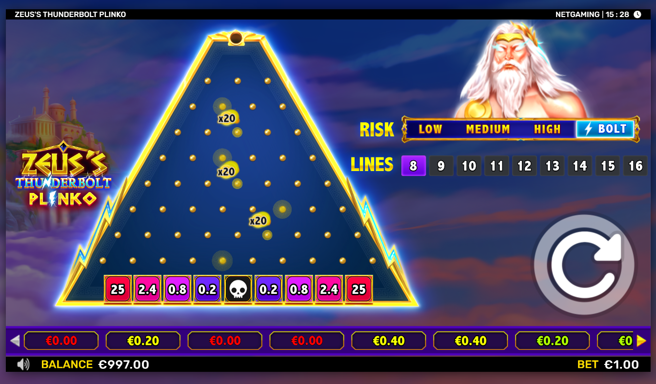 Plinko has always been a favourite among games of chance, and NetGaming has successfully modernised this format with a divine twist. The game features a pyramid-shaped board where balls drop from the top and bounce unpredictably across a field of pins, eventually landing on a multiplier slot. What makes this version truly stand out is the incorporation of Zeus’s signature elements: thunder, lightning, and the incredible BOLT mode.