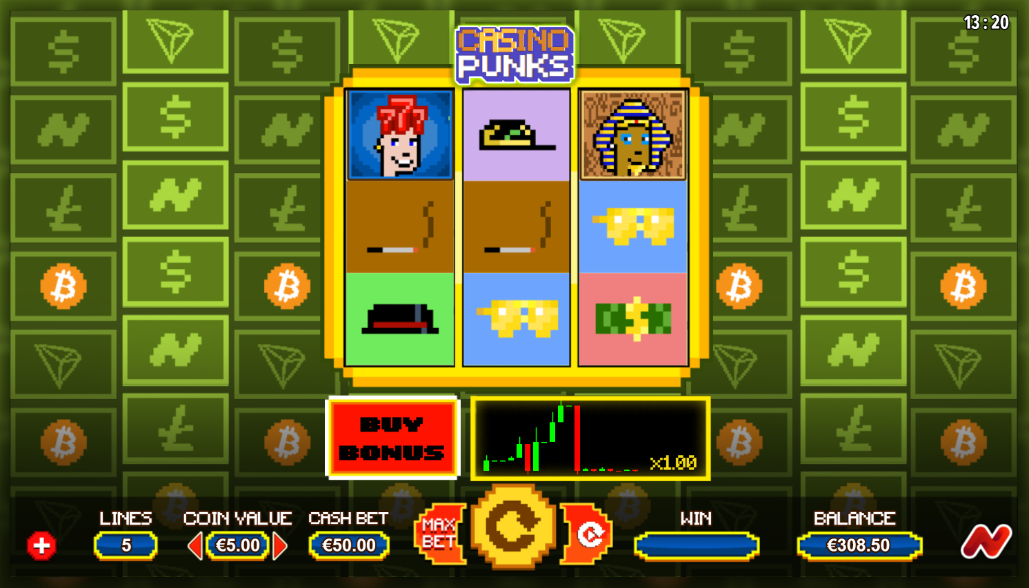3 Bonus symbols anywhere on the reels award 5 Punk free spins. 3 Bonus symbols during Punk free spins award 5 additional free spins. In Punk free spins #WAGMI multiplier starts with x5. The minimum and maximum multiplier in free spins is x5 to x100. The multiplier changes by a maximum of +40 after each free spin. During Punk free spins the multiplier either increases or remains the same. It never decreases.