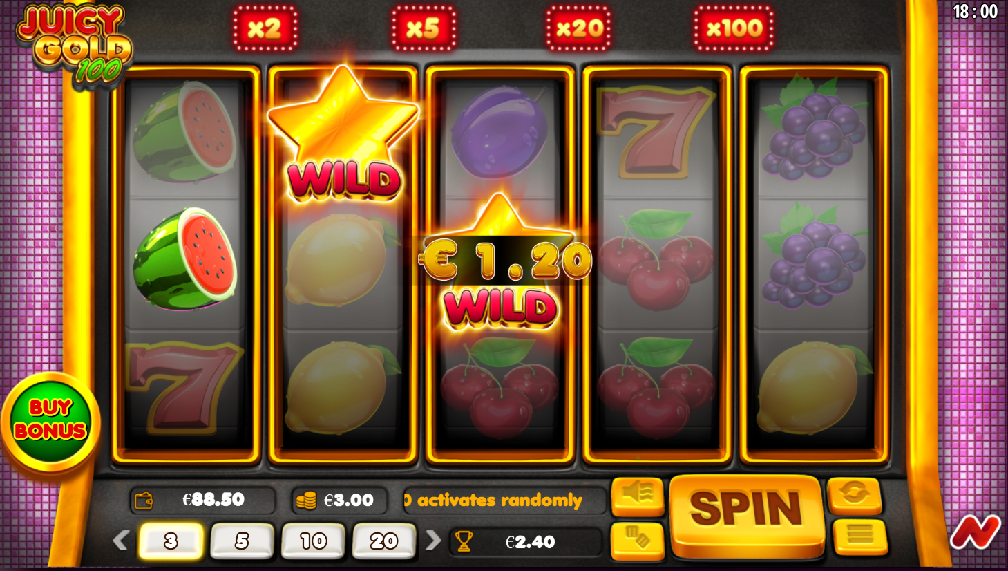 With a random multiplier up to 100x in the base game and a progressive multiplier up to 100x in Free Spins, this game cannot get any simpler. Our buy bonus feature always adds to the excitement as you can cut to the chase and enter Free Spins immediately. At its core, Juicy Gold 100 offers a familiar 5-reel, 3-row layout, but it’s the game’s special features that truly set it apart: